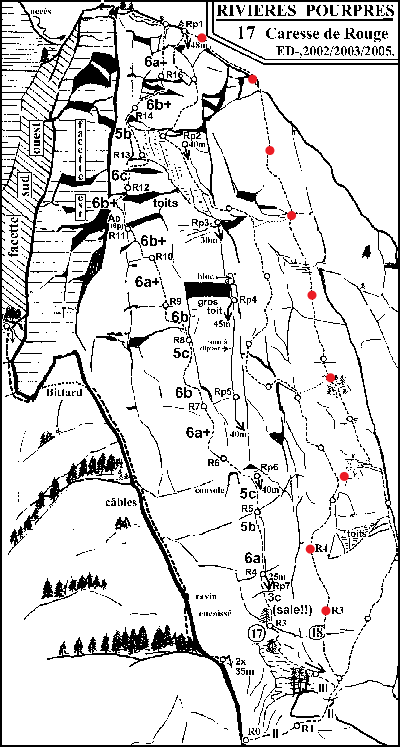 Les câbles d’accès au Pilier des Rivières Pourpres existent toujours, mais sont en très mauvais état, et ne doivent pas être utilisés, l’accès peut se faire par les rappels de Rivières Pourpres, ou dans la nouvelle ligne qui utilise les 5 derniers relais de l’Extension du domaine de la lutte, puis deux rappels hors voie et enfin R4 et R3 des Rivières Pourpres (voir le schéma ci-dessous). Au passage, quelques points ont été ajoutés dans l’Extension du domaine de la lutte aux endroits jugés dangereux.